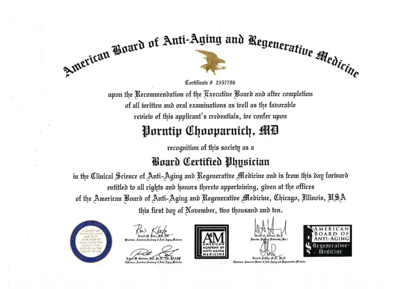 - วุฒิบัตรผู้เชี่ยวชาญด้านเวชศาสตร์ชะลอวัยและฟื้นฟูสภาวะเสื่อม จาก American Association of Anti-Aging Medicine (A4M), สหรัฐอเมริกา