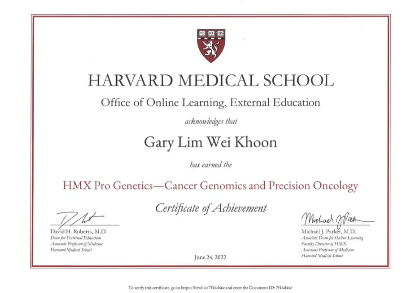 - ได้รับประกาศนียบัตรหลักสูตร HMX Pro ด้านพันธุศาสตร์ – พันธุศาสตร์มะเร็งและการรักษามะเร็งแบบแม่นยำ (Cancer Genomics and Precision Oncology) จากโรงเรียนแพทย์แห่งมหาวิทยาลัยฮาร์วาร์ด (Harvard Medical School)