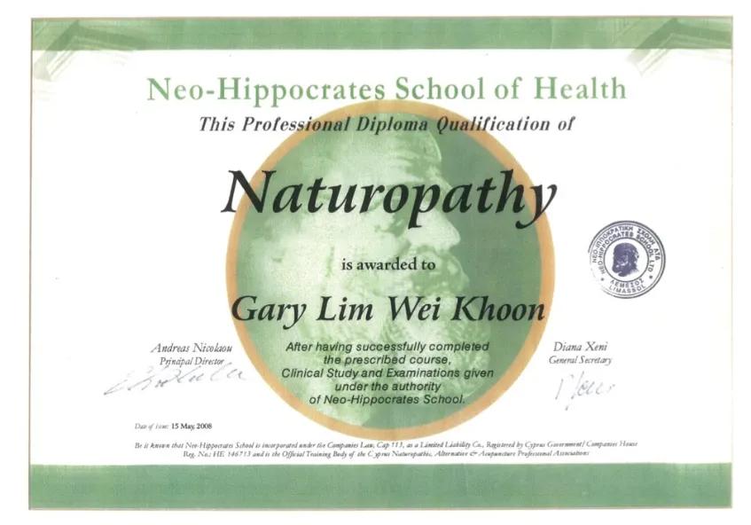 - ได้รับประกาศนียบัตรด้านธรรมชาติบำบัด (Naturopathy) จากวิทยาลัยการแพทย์ธรรมชาติบำบัด (CNM) สหราชอาณาจักร