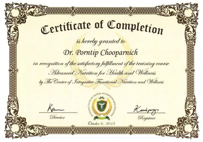 - ประกาศนียบัตรโภชนาการขั้นสูงเพื่อสุขภาพและความสมบูรณ์แข็งแรง จาก Center of Integrative Functional Nutrition and Wellness (IFNW), สหรัฐอเมริกา
