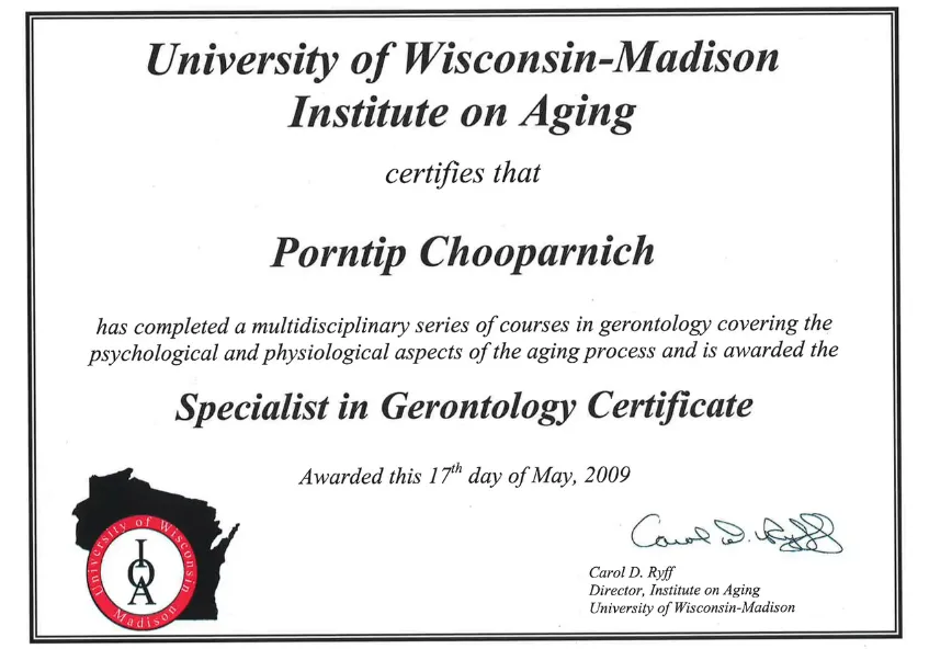 - ประกาศนียบัตรผู้เชี่ยวชาญด้านวิทยาศาสตร์ผู้สูงอายุ จากสถาบัน Institute of Aging, University of Wisconsin-Madison, สหรัฐอเมริกา
