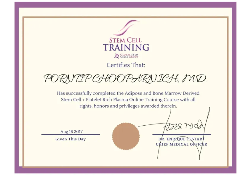 - ประกาศนียบัตรการฝึกอบรมสเต็มเซลล์และเกล็ดเลือดเข้มข้น (Platelet Rich Plasma) จาก Global Stem Cell Group, สหรัฐอเมริกา